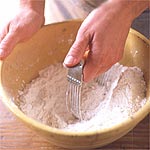 When cutting fat into the dry ingredients, it is important that the butter is chilled so that it doesn’t melt. Butter is best cut into dry ingredients with a pastry blender, a stainless steel device that consists of a series of curved rigid wires attached to a handle. Push the wires into the butter-flour mixture, using your fingers to push out clumps that accumulate. The purpose of this procedure is to coat the flour particles with butter until the mixture resembles coarse meal. As the butter melts during baking, the moisture contained in it produces steam, which gives these breads a flaky, tender crumb. |
