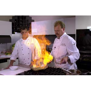 | Chef Frank and I are preparing Veal Chop topped with Asiago Risotto Crust & Portabella Sauce for a cooking show. |